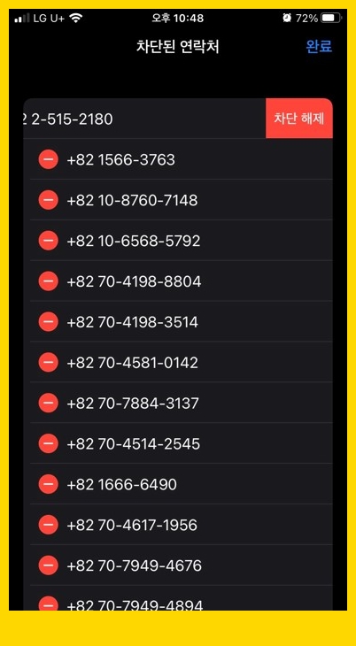 차단을 풀 전화번호를 왼쪽으로 밀어주면 '차단 해제' 문구가 나타납니다. 그 문자열을 터치하면 차단된 연락처 목록에서 삭제되면서 차단 설정이 해제됩니다.
